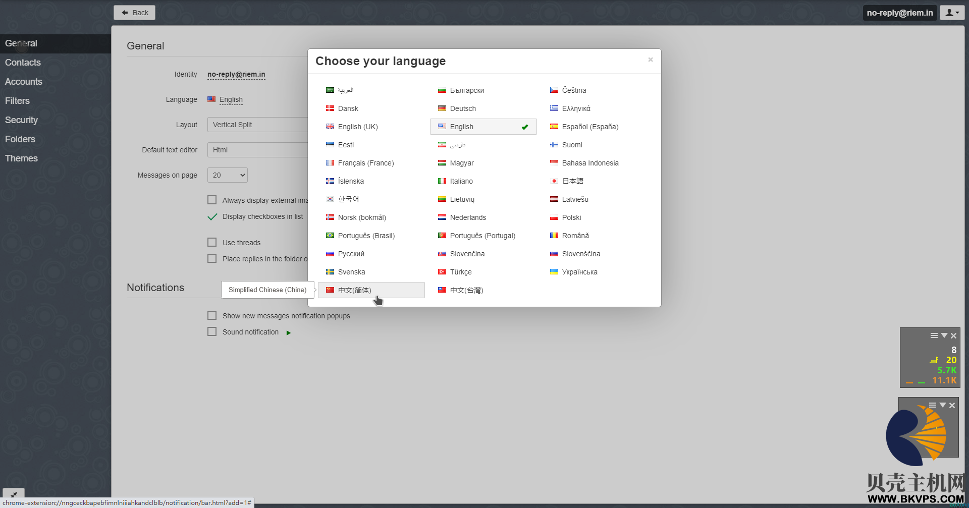 Rainloop设置中文,首先点击左下角的设置,然后选择General,点击Language后面的语言,选择中文